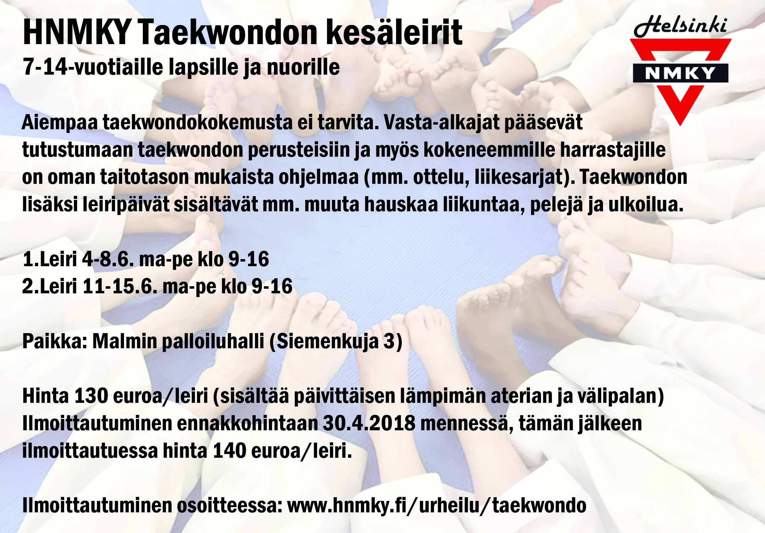 Taekwondon perusteet -ryhmät sopivat lapsille, nuorille ja aikuisille (alaikäraja 10 vuotta). Myös keskustan Perhetaekwondo -ryhmässä su klo 13-14 on vielä vapaita paikkoja, mukaan voi tulla lapset 5-vuotiaista alkaen. Lisätietoa: sarianne.nordberg(a)hnmky.fi, /urheilu/taekwondo/aloita-taekwondo/