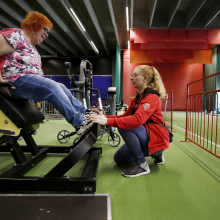 “Ryhmissä teemme tuolijumppaa ja tasapainoharjoitteita. Yksityisasiakkaitteni kanssa käymme asiakkaan kunnosta riippuen kävelylenkeillä, kuntosalilla tai suunnittelen heille porrastreenin”, Närvä kertoo.