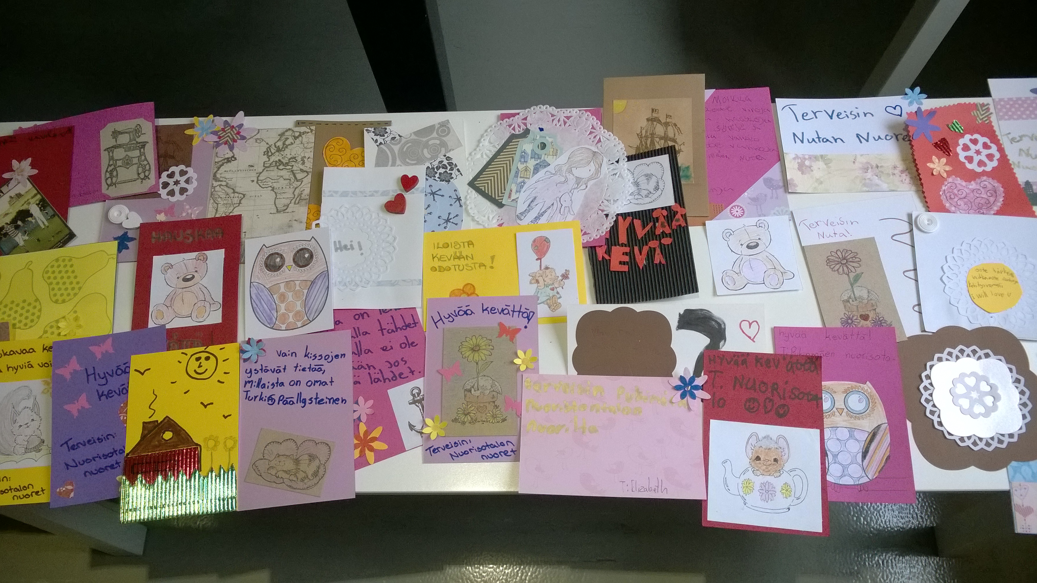 Maanantaina 23.2 Pukinmäen toimintakeskuksen lapset askartelivat piristyskortteja läheisen vanhainkodin asukkaille. Puksun lapset taiteilivat 42 korttia, jotka toimitettiin seuraavana päivänä vanhainkodin kahvihetkeen. Mummot ja papat olivat onnessaan yllätyskorteista ja johtaja oli mielissään Hanne Mäkelän hyvästä ideasta. Toivomme, että tästä jäisi perinne Pukinmäkeen.