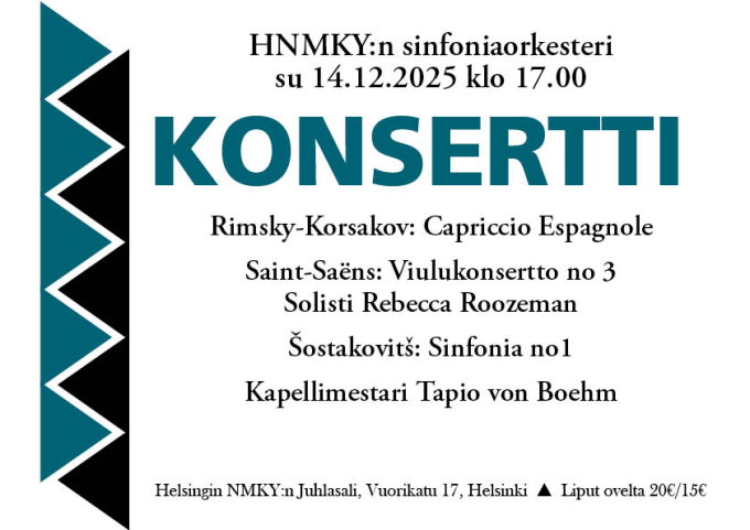 Sunnuntaina 14.12.2025 klo 17:00 Helsingin NMKY:n sinfoniaorkesteri musisoi Vuorikadun Juhlasalissa!