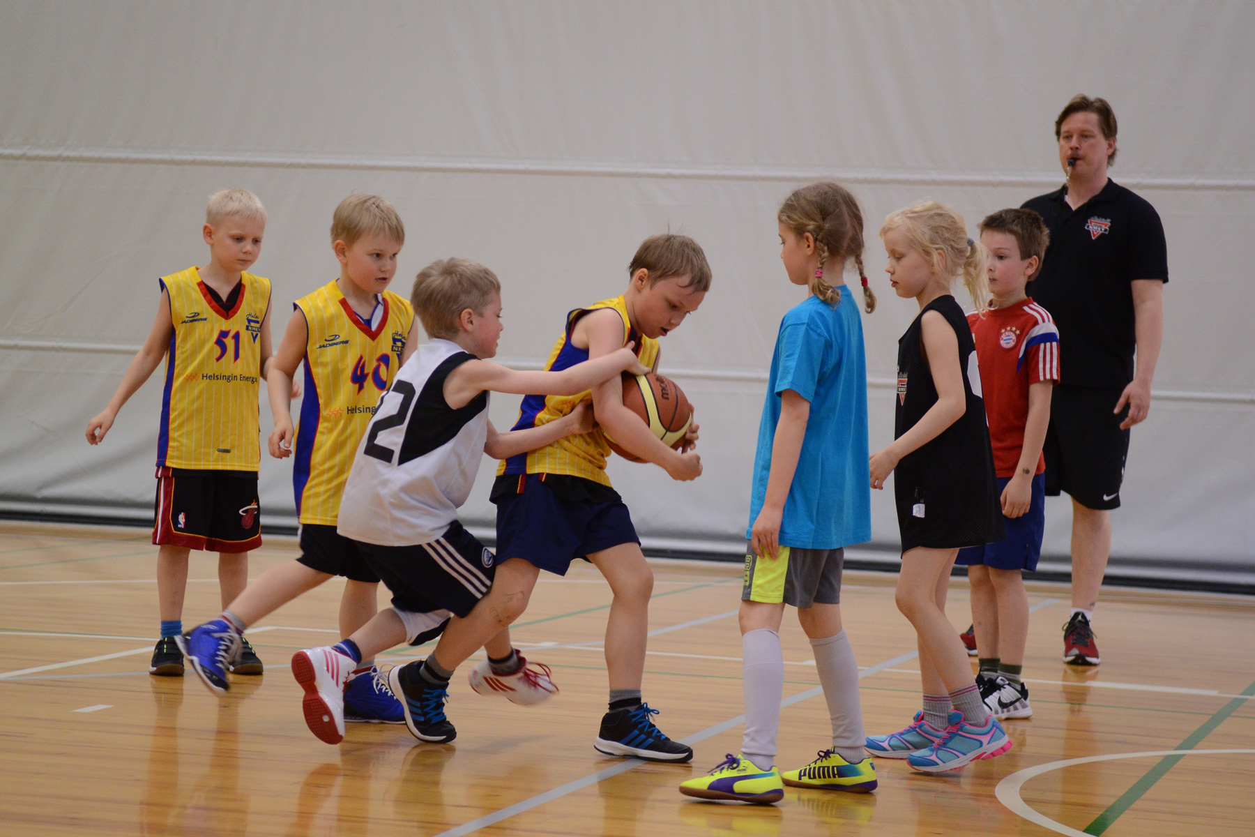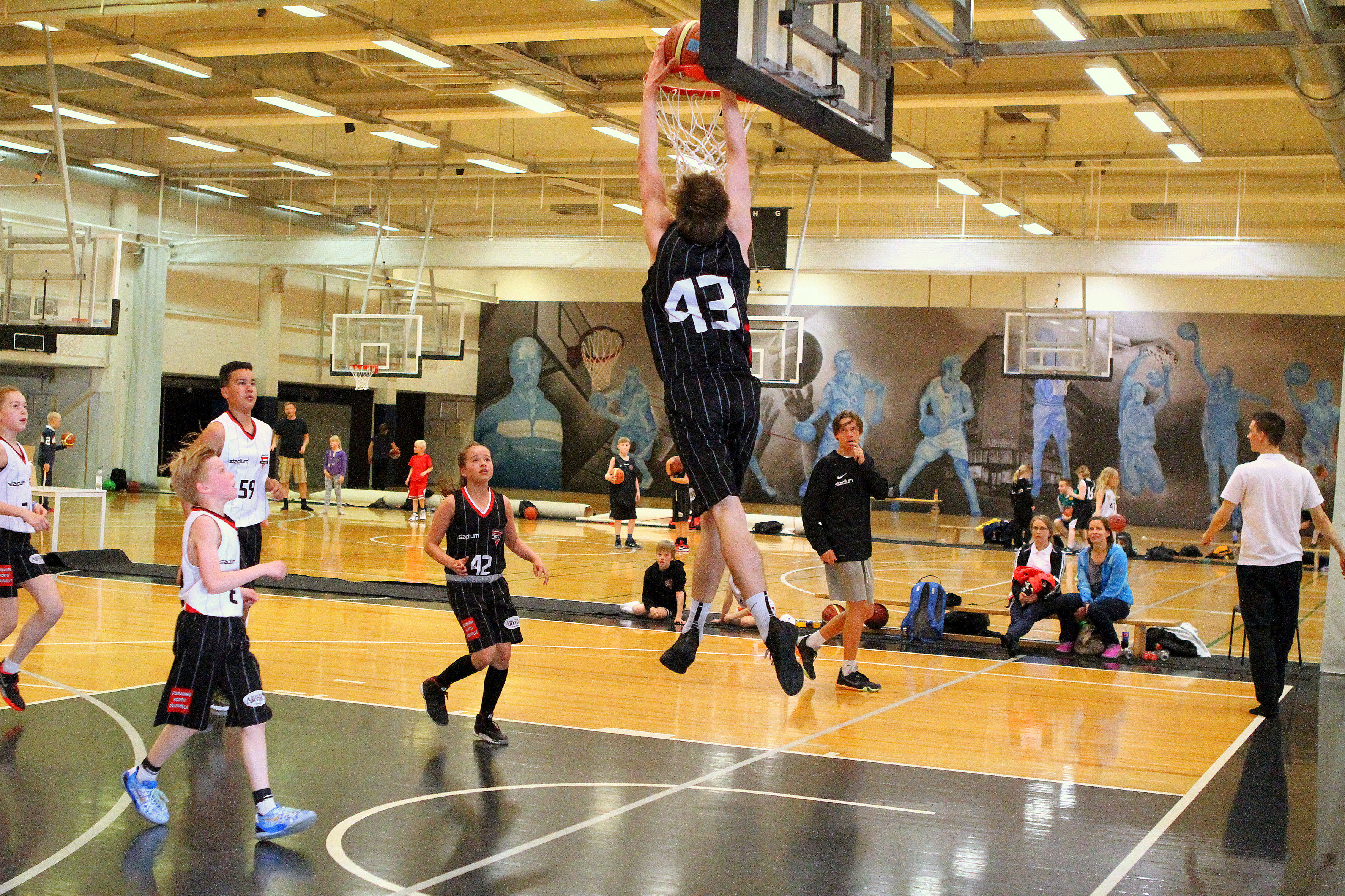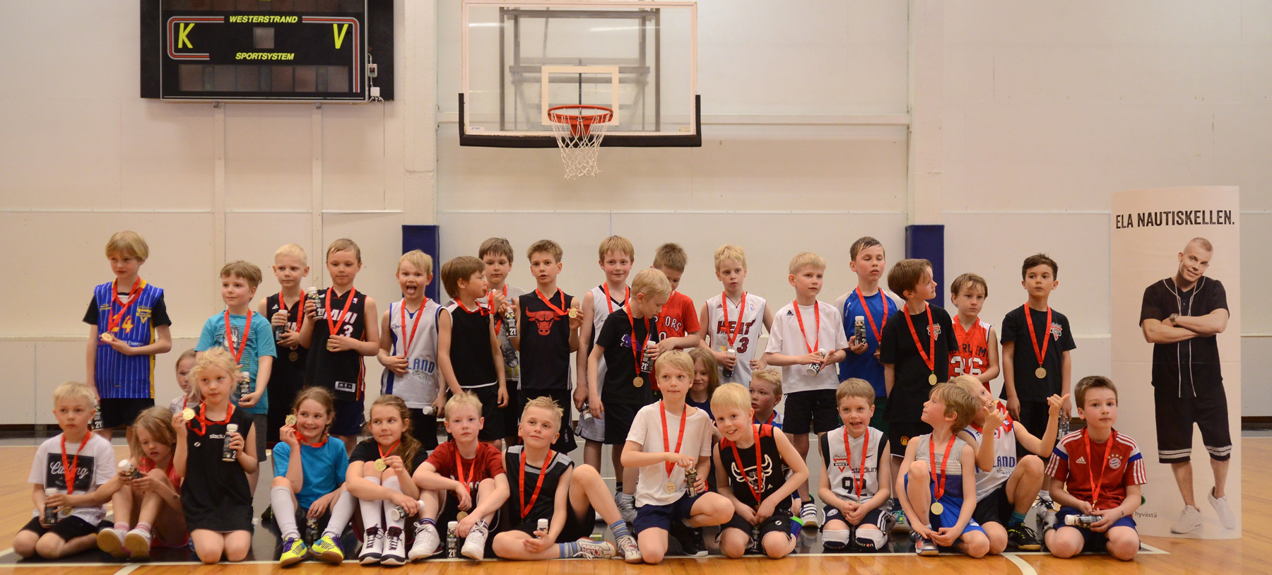 Nuorimmat koripalloilijat aloittivat päivän klo 11.00 kun seuran sisäinen NBA -turnaus pyörähti käyntiin. Kentällä tekeminen oli hienoa katseltavaa, 5-8 -vuotiaat tytöt ja pojat pelasivat kovalla tempolla, tekivät näyttäviä syöttöjä ja heittoja, sekä nähtiin kentällä myös monen pelaajauran ensimmäinen kori. Turnauksessa pelattiin tiiviissä tahdissa monta peliä ja vaikka väsymys painoi ehkä jossain kohti jaloissa, ei hymy hyytynyt missään kohtaan. Sadan supermikropelaajan kasvoilta paistoi pelien jälkeen palo koripalloon, eikä syyttä. Onko mitään hienompaa kuin aloittaa peliuransa pelaamalla satapäiselle yleisölle?
