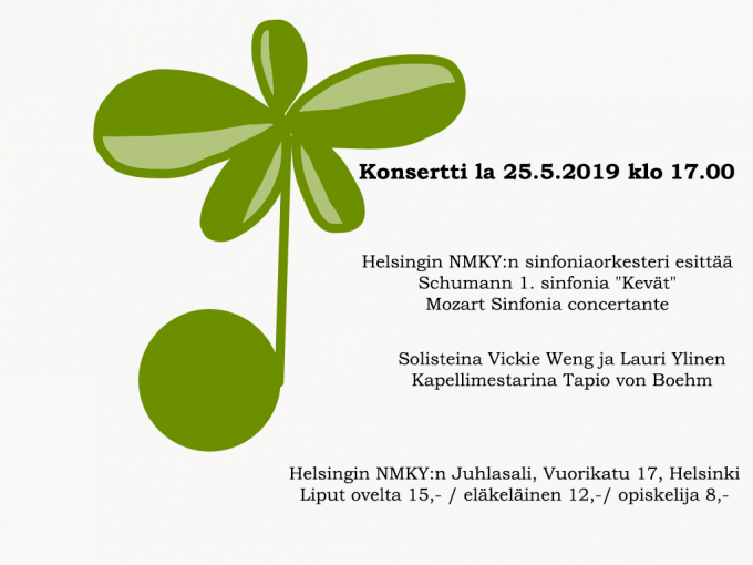 Helsingin NMKY:N sinfoniaorkesteri esittää Schumann 1. sinfonia "Kevät" Mozart Sinfonia concertante.